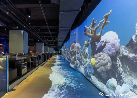 墻壁投影技術可以應用在餐廳的包間里,將3D動畫投射到餐廳的四壁,形成一個完全沉浸式的房間,可以根據(jù)不同的環(huán)境而變化,可以是海底世界,也可以是茂密的叢林,也可以是雪花飛舞,花鳥成群,讓顧客在用餐的時候,仿佛回到了大自然之中,享受著視覺和味覺的碰撞。