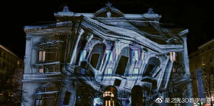 建筑投影技術(shù)是利用建筑物自身的結(jié)構(gòu)特征,采用3D Mapping,將室外投影技術(shù)投射到建筑物上。不同的場(chǎng)景切換,給人一種視覺(jué)上的錯(cuò)覺(jué),仿佛身臨其境一般。