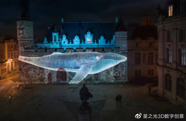 法國拉羅謝爾市政府大樓在六年后重新裝修后,將其改造成一幅由海洋圖像、天空、陸地和植物組成的建筑投影。風(fēng)門是羅馬風(fēng)格的教堂的一個重要組成部分,揚·恩吉瑪就以此為靈感,設(shè)計了一打的圖畫。