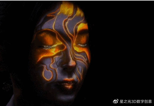 利用3D動畫技術,產生臉部藝術效果,再將其投影到人的臉部,從而構成“影像面具”,從海洋、海豚到面具碎片,都是非常精細的。