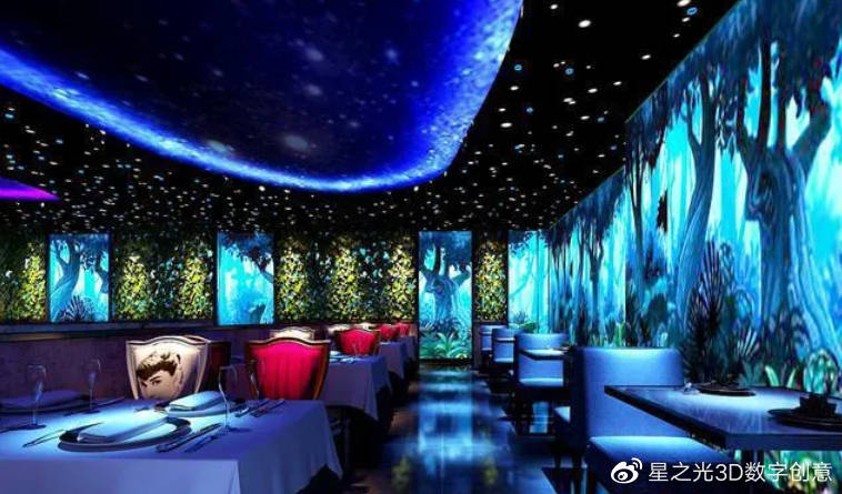 “全息餐廳”是最近幾年興起的一項(xiàng)新技術(shù),將全息膠片與投影機(jī)技術(shù)結(jié)合,然后將畫面中的內(nèi)容進(jìn)行還原,形成全息影像,被稱為“沉浸式”、“全息餐廳”、“三維全息沉浸式”、“3D全息餐廳”等等。