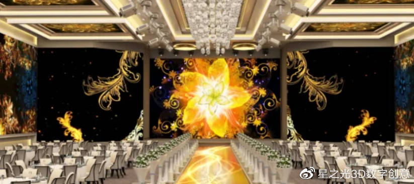 5D全息宴會(huì)廳僅僅只需要少量的軟裝,就可以使整個(gè)婚禮現(xiàn)場的5D效果更加完美,同時(shí)也為新人們節(jié)約了大量的婚禮場地搭建成本。